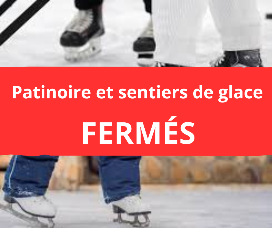 Fermeture temporaire de la patinoire à partir de vendredi le 9 janvier 2026 jusqu'à nouvel ordre. Afin de préserver la glace et prévenir les dégât pouvant être causés par la température douce (supérieur à zéro) et la pluie. Désolés des inconvénients mais c'est pour le mieux.